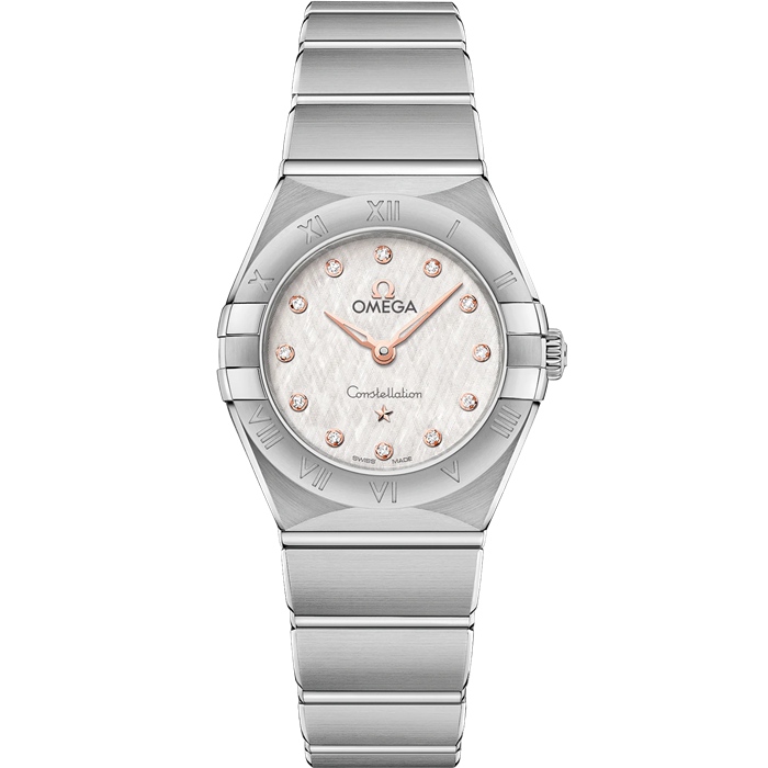 Dit 25 mm roestvrijstalen model is voorzien van een bezel met gegraveerde Romeinse cijfers, een crème- en champagnekleurige wijzerplaat met een zijdeachtig patroon en krasvast saffierglas. De wijzers, het Omega logo, de Constellation ster en de diamanten houders zijn van 18K Sedna™ goud.
