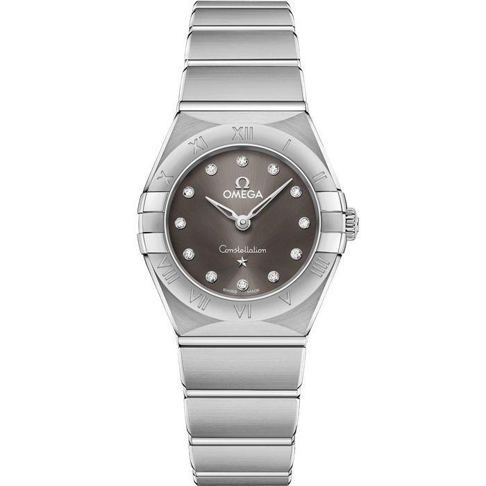 Dit 25 mm roestvrijstalen model is voorzien van een bezel met gegraveerde Romeinse cijfers, een zongeborstelde grijze wijzerplaat met diamanten uurmarkeringen en krasvast saffierglas. De wijzers, het OMEGA logo, de Constellation ster en de diamanten houders zijn van 18K witgoud.