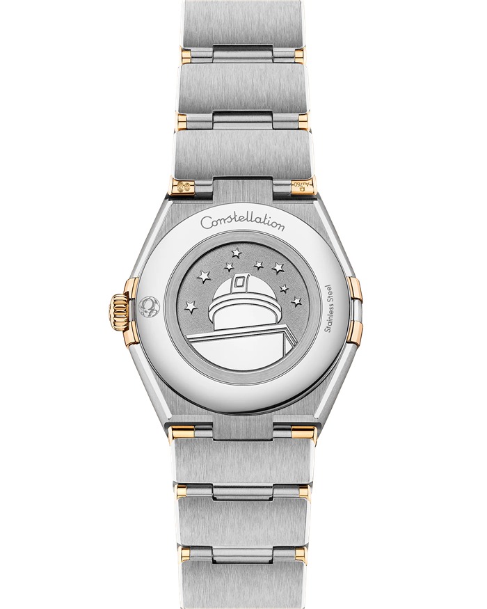 Dit 28 mm 18K geelgouden en roestvrijstalen model is voorzien van een bezel met gegraveerde Romeinse cijfers, een zongeborstelde champagnekleurige wijzerplaat met diamanten uurmarkeringen en krasvast saffierglas. De wijzers, het OMEGA logo, de Constellation ster en de diamanten houders zijn ook van 18K geelgoud.