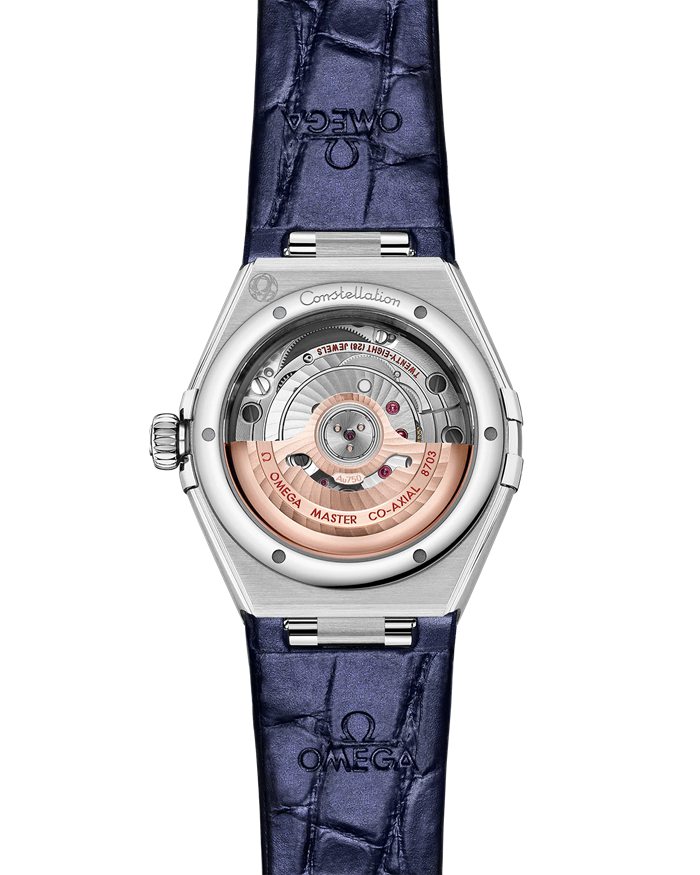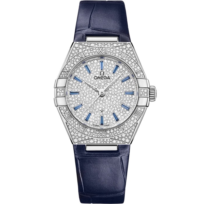 De verbazingwekkende aandacht voor detail wordt voortgezet op de 18K witgouden wijzerplaat, die volledig is geplaveid in een sneeuwzetting van 354 enkelgeslepen diamanten. Het horloge heeft ook een 18K witgouden Constellation ster, en het mooiste, een cirkel van 12 baguettegeslepen blauwe saffier uurmarkeringen in 18K witgouden houders. De wijzers zijn van PVD Canopus Gold™.