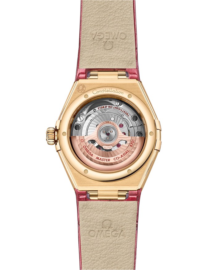 Dit 29 mm 18K geelgouden model heeft een met diamant bezette bezel, een parelmoeren wijzerplaat met diamanten uurmarkeringen en een datumvenster op 6 uur. De wijzers, het OMEGA logo, de Constellation ster en de diamanten houders zijn ook van 18K geelgoud.