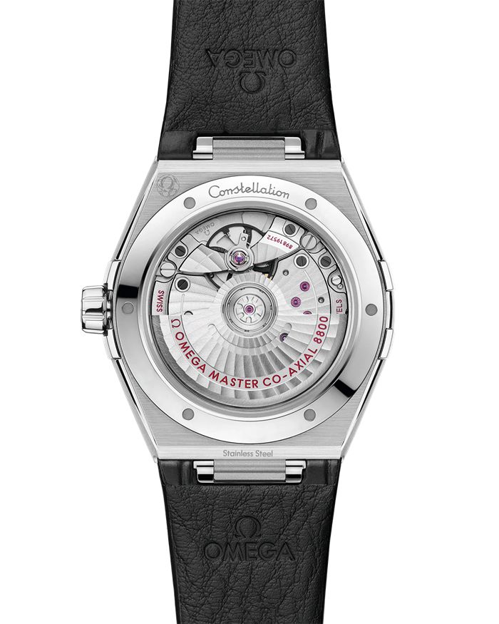 Dit 39 mm roestvrijstalen model heeft een bezel met zwarte Romeinse cijfers, een zongeborstelde zwarte wijzerplaat en een datumvenster op 6 uur. De wijzers, het OMEGA logo, de Constellation ster en de uurmarkeringen zijn allemaal van 18K witgoud.