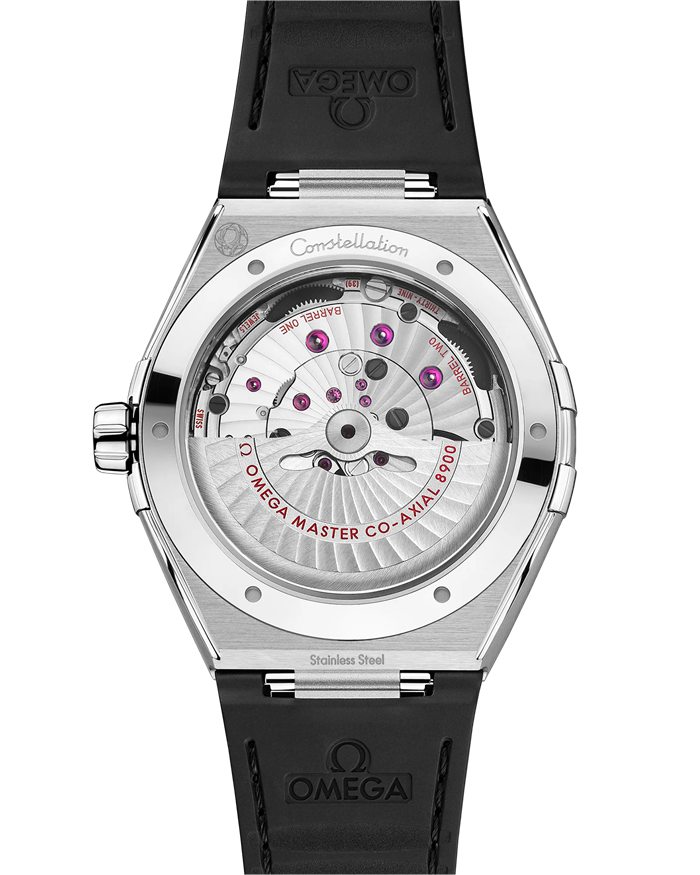 Dit 41 mm roestvrijstalen model heeft een gepolijste zwarte keramische bezel met Romeinse cijfers van Liquidmetal™, een zongeborstelde zwarte wijzerplaat en een datumvenster op 6 uur. De wijzers, het OMEGA logo, de Constellation ster en de gefacetteerde uurmarkeringen zijn allemaal gerhodineerd.