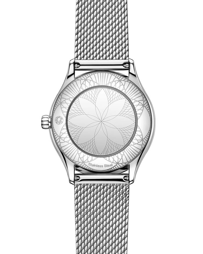 Dit roestvrijstalen model heeft een 26 mm kast bezet met diamanten die de rondingen van het horloge aan weerszijden op elegante wijze volgen. De kroon is eveneens bezet met een enkele diamant omgeven door een bloem in rood hybride ceramic. De gewelfde wijzerplaat van gebroken wit ‘Grand Feu’ email is versierd met in grijs afgewerkte Romeinse cijfers.