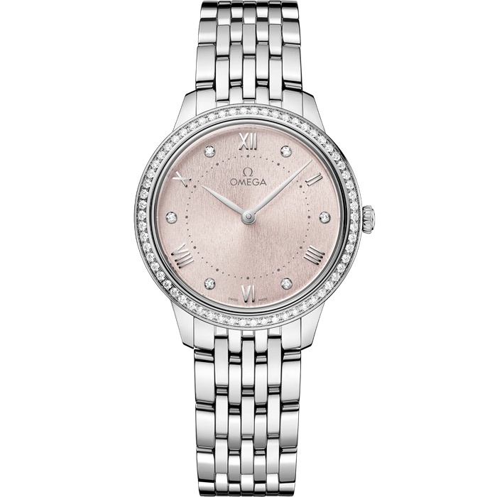 Dit 30 mm roestvrijstalen model heeft een met diamanten ingelegde bezel en een met zilverachtig roze PVD gecoate wijzerplaat met een gestempeld willekeurig verticaal patroon met zongeborstelde afwerking. De wijzerplaat onderscheidt zich door de gerhodineerde wijzers, evenals de afwisselende Romeinse cijfers en de diamanten markeringen.