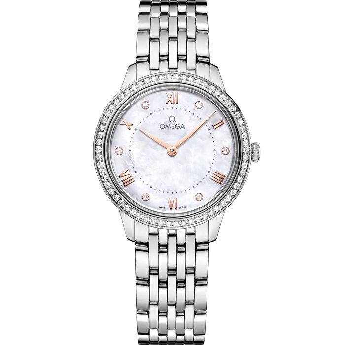 Dit 30 mm roestvrijstalen model heeft een met diamanten ingelegde bezel en een wijzerplaat van wit parelmoer. De wijzerplaat onderscheidt zich door de met PVD gecoate wijzers van Sedna™ Gold, evenals de afwisselende Romeinse cijfers en de diamanten markeringen die gezet zijn in houders van 18K Sedna™ Gold.