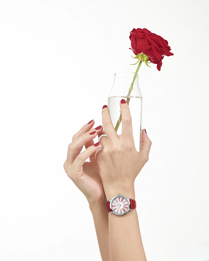 Voor dit model is de slanke kast van 36 mm gemaakt van roestvrij staal en voorzien van 38 enkelgeslepen diamanten, die op elegante wijze langs de zijkanten zijn bezet. De gelakte witte wijzerplaat wordt omringd door in rood afgewerkte Romeinse cijfers, terwijl de kroon één diamant bevat, dit keer omringd door een rode keramische bloem gemaakt van vijf Omega logo’s.