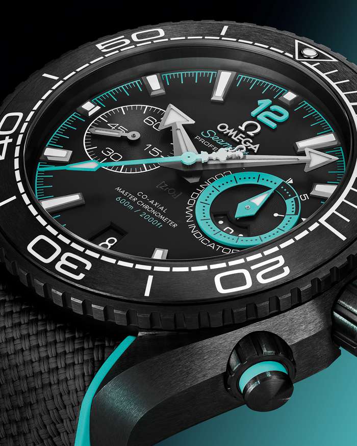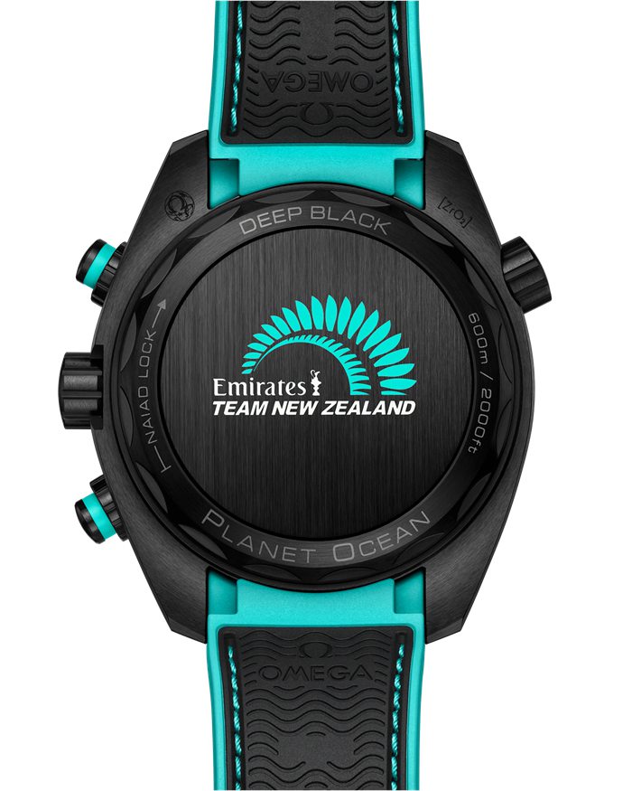 Op de matte keramische wijzerplaat geeft OMEGA een knipoog naar het protocol vóór de race, met een COUNTDOWN INDICATOR op 3 uur, compleet met START met vlag. De wijzer van de indicator en de ring van de hulpwijzerplaat zijn in het turquoise van het ETNZ-logo, samen met de minutenring, het cijfer 12 en de centrale secondewijzer van de chronograaf met America’s Cup trofee-tegengewicht. OMEGA heeft deze kleur ook gebruikt voor de ringen van de zwart geborstelde keramische pushers, de HE op het heliumventiel en het OMEGA-logo op de kroon.