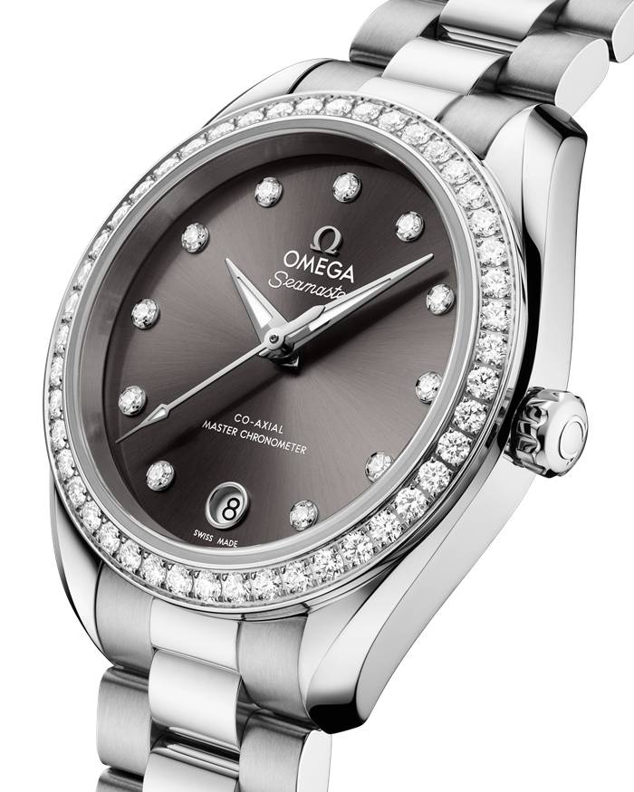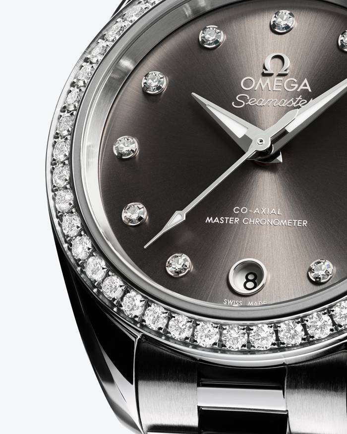 De zongeborstelde grijze wijzerplaat is met PVC gekleurd en gelakt en voorzien van een rond datumvenster op 6 uur. Ze wordt geaccentueerd door 11 diamanten uurmarkeringen en gefacetteerde wijzers met een vernieuwd design, waarbij de minutenwijzer taps toeloopt naar een delicate punt. Alle wijzers en opgelegde elementen zijn van 18K witgoud. Daarnaast zijn de wijzers opgevuld met wit Super-LumiNova dat blauw oplicht.