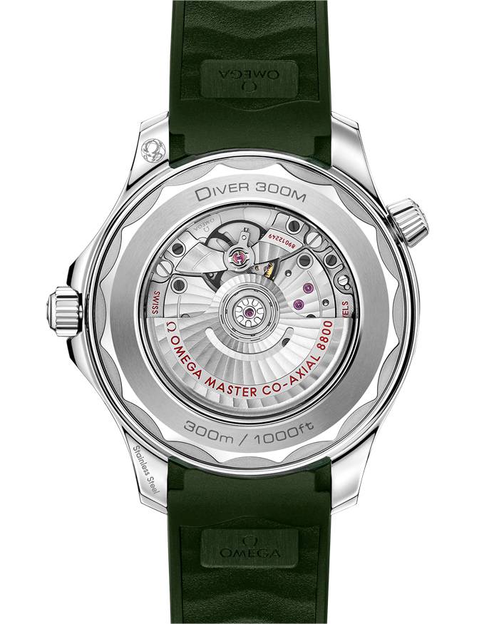 Dit 42 mm model is gemaakt van roestvrij staal en heeft een groene keramische bezel met een witte geëmailleerde duikschaal. De wijzerplaat is eveneens van gepolijst groen keramiek en voorzien van lasergegraveerde golven en een datumvenster op 6 uur.