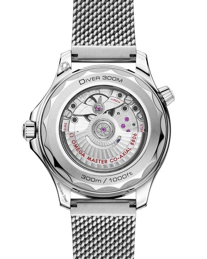 Zwart aluminium wordt ook gebruikt voor de wijzerplaat, die is voorzien van een lasergravure van het iconische golfpatroon van de Diver. De skeletonwijzers en -uurmarkeringen zijn gerodineerd en opgevuld met witte Super-LumiNova. De andere markeringen, zoals het OMEGA logo, zijn in het wit aangebracht.