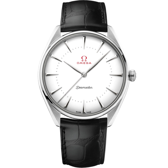 Dit 39,5 mm model heeft een 18K Canopus Gold™ kast en een zwarte, leren band. Op de gewelfde eierschaal-witte geëmailleerde wijzerplaat prijkt het opvallende vintage OMEGA logo. De minutenring en de letters Seamaster zijn tevens in email uitgewerkt. De bladvormige wijzers en de toegepaste uurmarkeringen zijn van 18K witgoud.