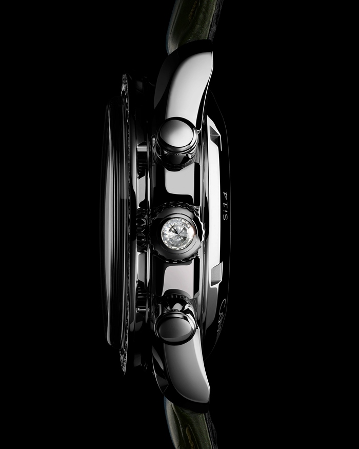 De groene PVD wijzerplaat is uitgerust met horizontale, ovaalvormige onderliggende wijzerplaten met een zilverachtige coating en een verticaal, ovaalvormig datumvenster op 6 uur. De gerodineerde, met diamant gepolijste uren- en minutenwijzers zijn opgevuld met wit Super-LumiNova dat groen oplicht.