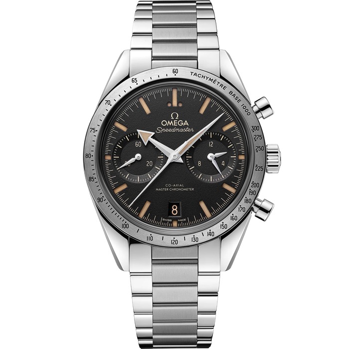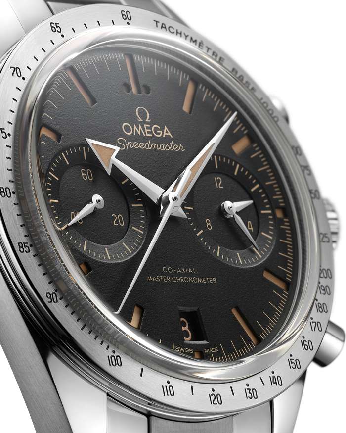 De geborstelde bezel heeft een zwarte tachymeterschaal. Op de achterzijde van de kast, die is uitgevoerd in vlak saffierkristal met anti-reflecterende coating aan de binnenkant, staat ’Speedmaster ’57’ gegraveerd.