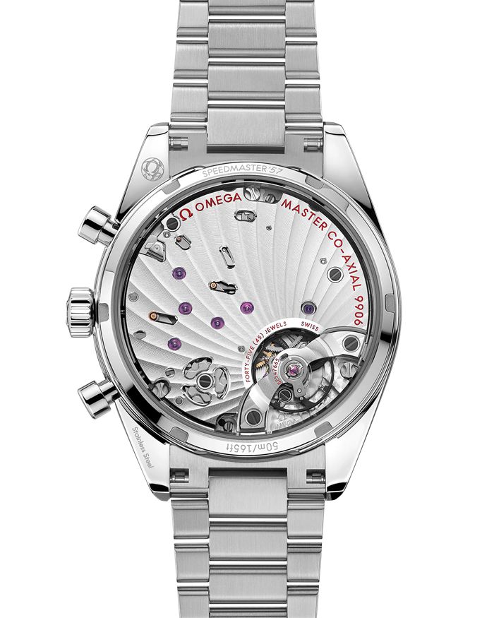 De geborstelde bezel heeft een zwarte tachymeterschaal. Op de achterzijde van de kast, die is uitgevoerd in vlak saffierkristal met anti-reflecterende coating aan de binnenkant, staat ’Speedmaster ’57’ gegraveerd.