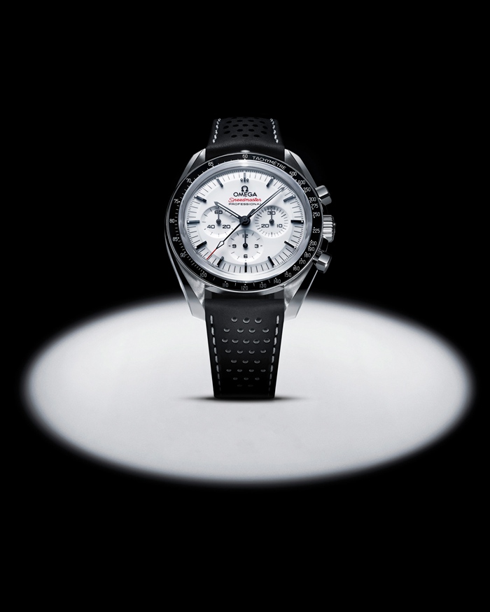 Deze 42 mm roestvrijstalen Moonwatch wordt gecombineerd met een zwarte microgeperforeerde leren band met rode en witte stiksels, en is voorzien van saffierglas aan de voor- en achterzijde van de kast. Het is geïnspireerd op de Speedmaster-stijl van de 4e generatie horloges die op de maan werd gedragen en heeft een asymmetrische kast, een wit gelakte getrapte wijzerplaat met opgelegd OMEGA logo en uurmarkeringen, wijzers in ‘Moonwatch’-stijl, en de beroemde ‘dot over 90’ op de zwarte geanodiseerde aluminium bezelring.