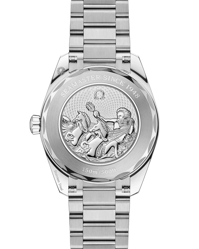 Deze 38 mm Aqua Terra heeft een symmetrisch vormgegeven horlogekast van volledig gepolijst roestvrij staal en wordt gecombineerd met een gepolijste en geborstelde band met prachtige geronde schakels.