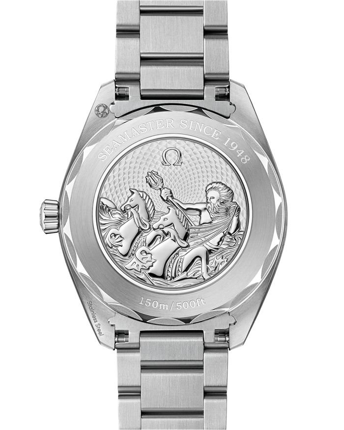 De wijzerplaat met teakhoutmotief in OMEGA’s eigen kleur Summer Blue heeft een PVD-coating met zongeborstelde afwerking en is gelakt met een kleurverloop om de waterdichtheid van het horloge aan te geven. Het heeft gerhodineerde wijzers en uurmarkeringen opgevuld met lichtblauwe Super-LumiNova en is voorzien van een bijpassend datumvenster op 6 uur.