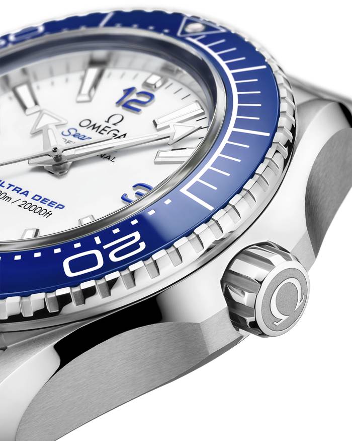 Dit 45,5 mm model van robuust O-MEGASTEEL heeft een gepolijste blauwe keramische bezel met duikschaal van wit emaille. De witgelakte wijzerplaat, zichtbaar door het gebolde en gewelfde saffierglas, heeft vier blauwe Arabische cijfers en 18K witgouden wijzers en uurmarkeringen – een voor een afgewerkt met een witte Super-LumiNova coating.
