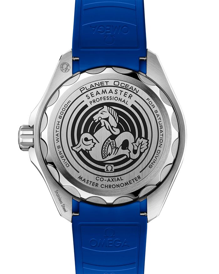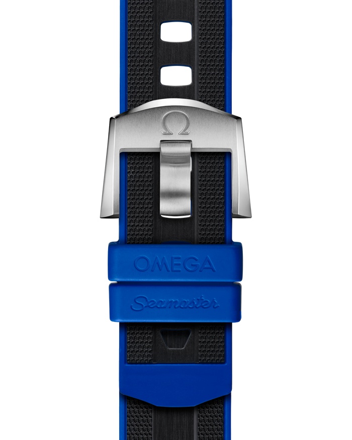 Dit 45,5 mm model van robuust O-MEGASTEEL heeft een gepolijste blauwe keramische bezel met duikschaal van wit emaille. De witgelakte wijzerplaat, zichtbaar door het gebolde en gewelfde saffierglas, heeft vier blauwe Arabische cijfers en 18K witgouden wijzers en uurmarkeringen – een voor een afgewerkt met een witte Super-LumiNova coating.